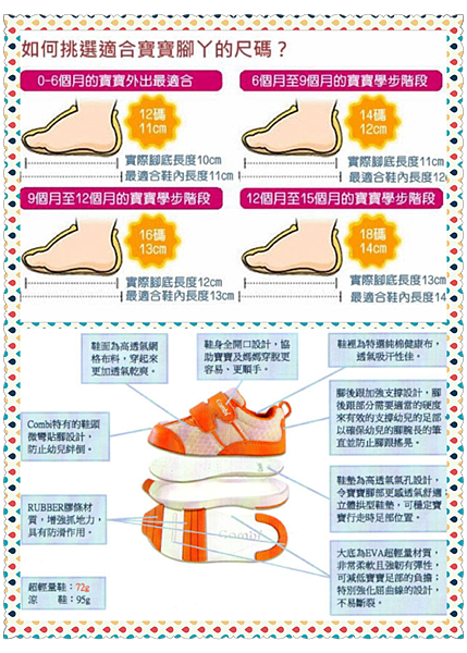 龍媽在挑選好小孩的學步鞋是針對哥哥腳底長12.5公分所以就要挑選13.5公分的鞋款而弟弟腳底長12公分所以就要挑選13公分的鞋款,Combi家鞋款都是點5結尾,所以哥哥剛好就買13.5弟弟應該買13公分龍媽就買13.5+他們家高透氣氣孔設計的鞋墊就剛剛好,它讓腳部更透氣舒適;立體拱型鞋墊,可穩定寶寶行走時足部位置!!
